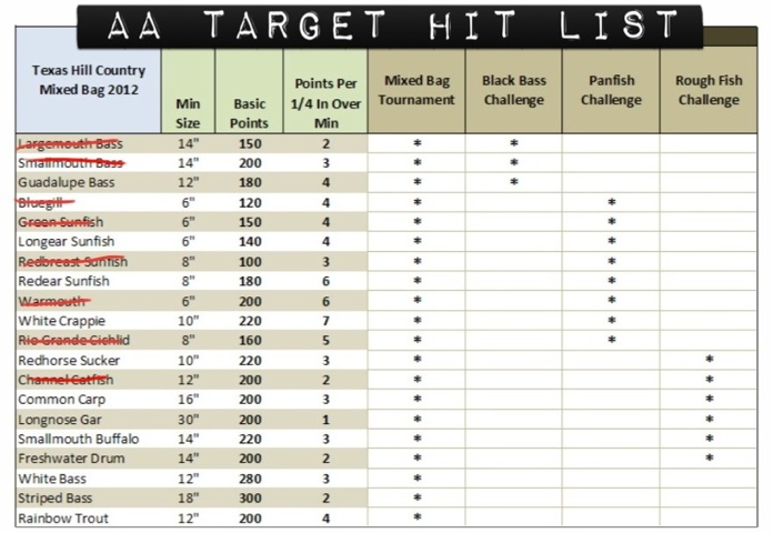 The Texas Hill Country Mixed Bag Contest 2012 is the first annual event sponsored by TexasRiverBum.com to promote fly fishing the Texas Hill Country. Offical rules and information can be found here: http://texasriverbum.com/texas-river-bum-mixed-bag-2012.